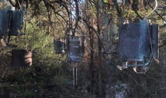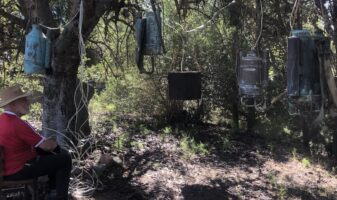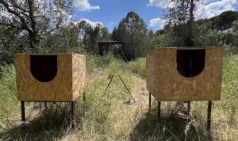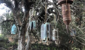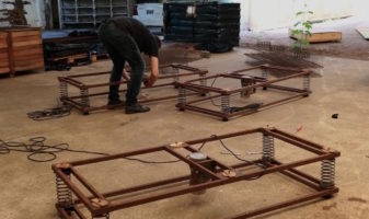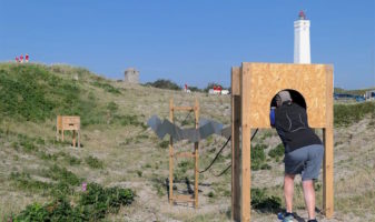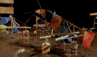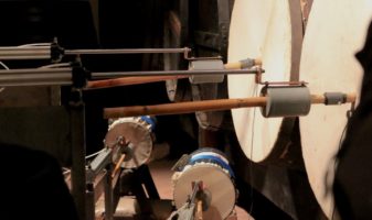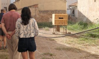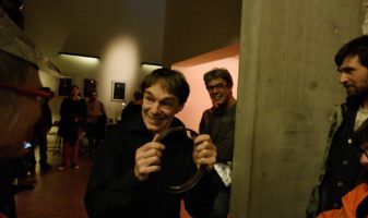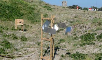 Aquí construimos una nueva versión de Bang Spring Time, diseñada para este lugar único y operada manualmente. Dos cabañas de madera sirven como cámaras de resonancia para los sonidos producidos por largos muelles metálicos. Al otro lado de los muelles, usamos «El Modulito», un cubo de cristal, ya presente en el campo, como cámara de sonido y observación. En el cubo, el público podía escuchar sonidos captados con micrófonos de contacto, además de los audibles en el espacio.